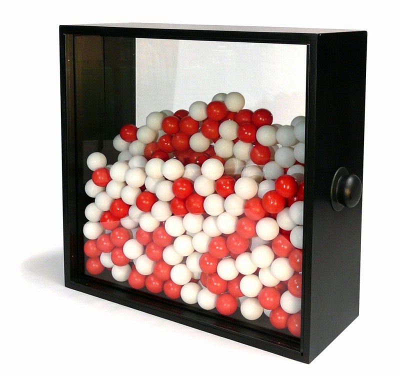 Ennio Chiggio Bispazio instabile, 1962, 50X50X15cm, sfere di celluloide bianche e rosse, vetri, contenitore di legno, Collezione privata. |