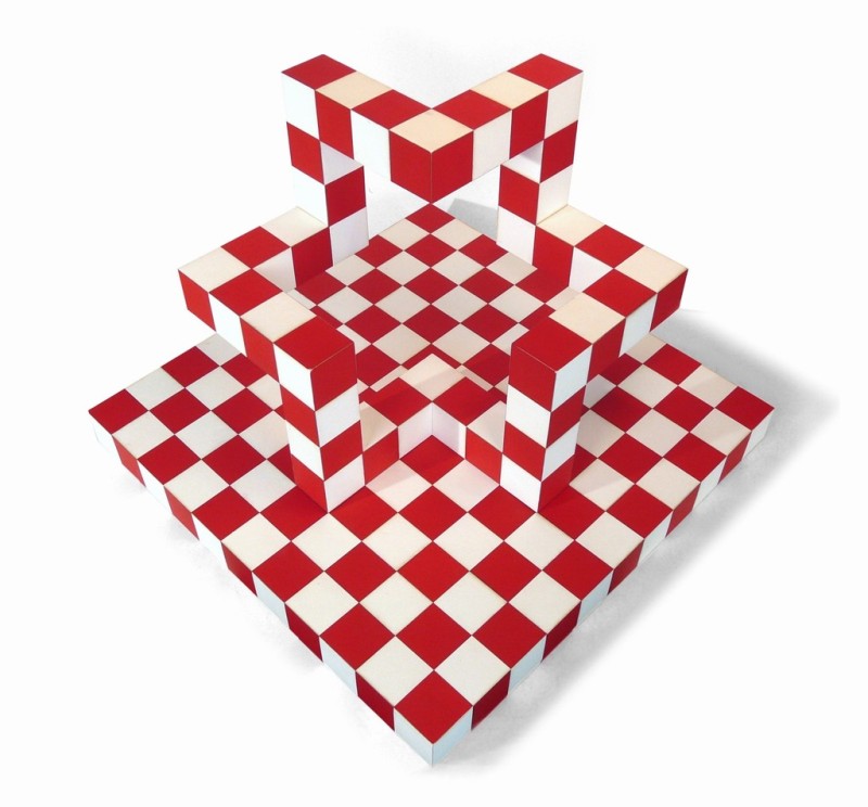 Between the years 1970 and '80 the collective work is diversified and Chiggio pursue their individual research through the transfer of its investigation into perceptual structures defined by alternating white-red field, able to modulate any surface scans through destabilizing the solid form received. These works are made with tempera on paper, screen prints on various media, dies on paper and kinetic structures. Chiggio In 1980 he had begun his teaching at the Academy in Venice in 1978, elaborates further their research in semiological around the set of Art, investigating the conduct of the historical avant-garde.
