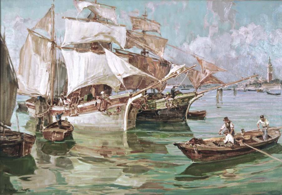 Angelo Brombo Velieri in laguna 1959 cm 70X100 olio su tela